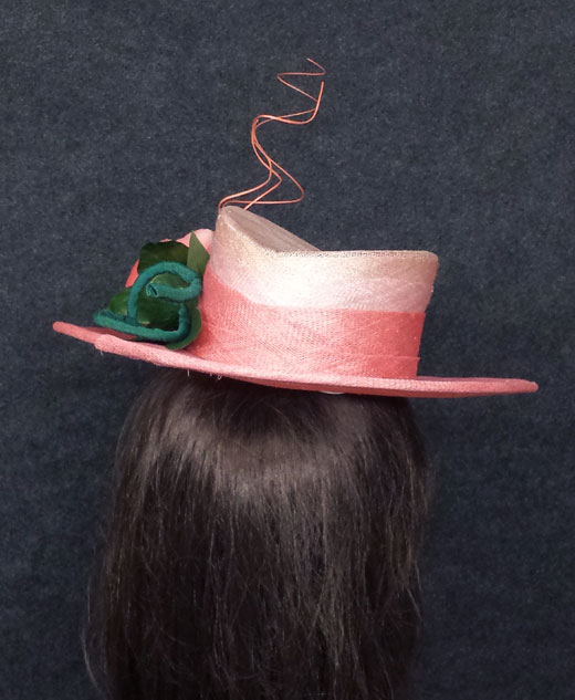 coral sinamay straw. Trimmed in coordinating sinamay bias